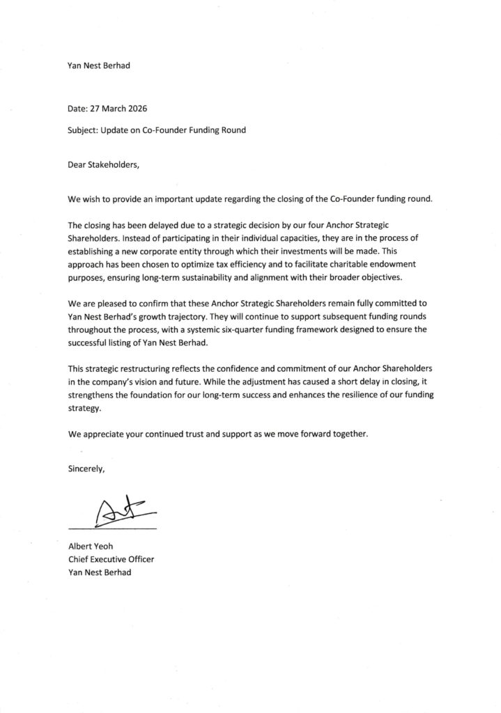 This restructuring—aimed at optimizing tax efficiency and long-term sustainability—establishes a system six-quarter funding framework to ensure the successful listing of Yan Nest Berhad.